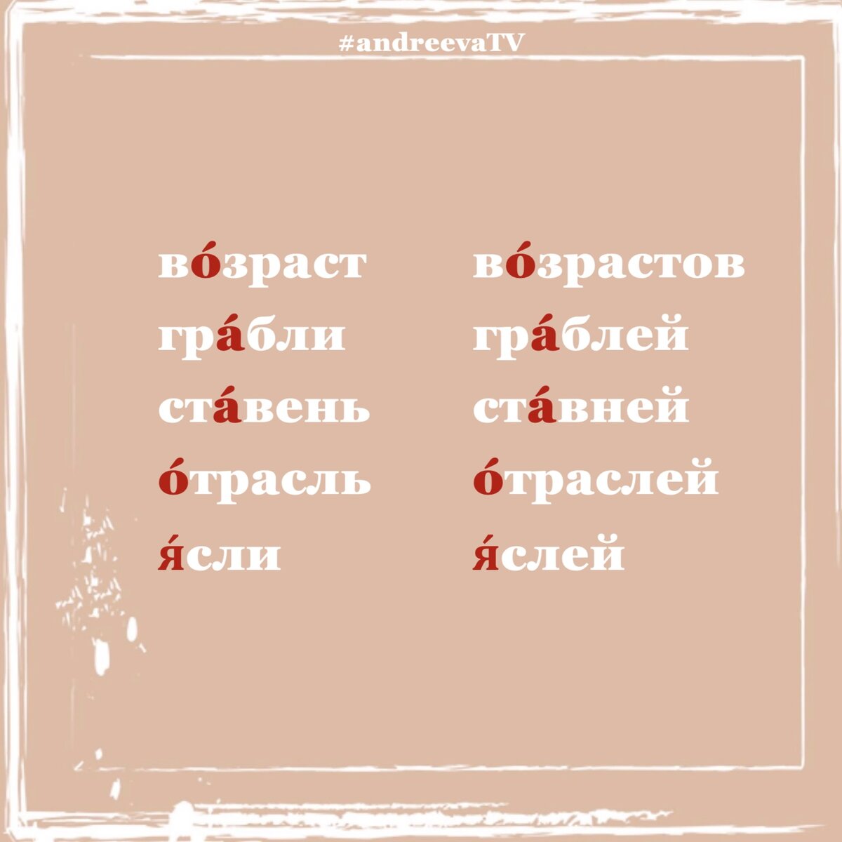 Ещё одна пятёрка слов с неподвижным ударением. Это значит, что как бы вы ни изменяли форму слова, ударение останется там же: вОзраст - вОзрасты - вОзрастами - вОзрастов (а не возрастОв). ❗️ Слово «ставень» имеет вариант женского рода «стАвня». Ударение в этом слове так же неподвижно: стАвня - стАвни - стАвень. ❗️ Отрасль имеет вариативное ударение при изменении формы во множественном числе: «Отраслей» и «отраслЕй», но первый вариант всё же пока предпочтительней. ❗️ Да-да, правильно говорить «Яслей», а не «Ясель» или «яслЕй». #andreevatv_орфоэпия