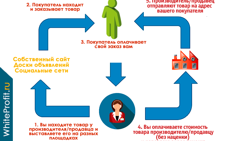 Вы находите покупателей и делаете заказ у партнера, который отправляет товары непосредственно на адрес заказчиков. Вы же получаете свой заработок в виде разницы между первоначальной ценой и вашей наценкой.