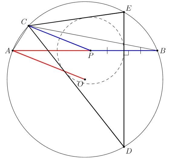 В результате видим, что CX биссектриса угла DCE и на биссектрисе взята такая точка P, что XP=XD=XE. Следовательно, P — центр вписанной окружности треугольника CDE по лемме о трезубце.