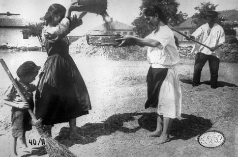 Солома убиралась, а зерно со всем мусором сгребали в кучу.