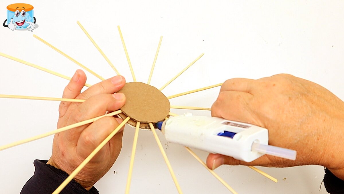 Вы просто не поверите! Одно простое движение с джутовой нитью в руках - и вы можете сделать двустороннее декоративное панно на стену! Для этого наипростейшего панно вам понадобится: Итак, берем картонный кгру, диаметром 6 см и делим его на 16 частей. 16 деревянных шпажет отрезаем на расстоянии 15 см и оставляем часть с заостренным концом. Приклеиваем отбеленный джут на кружок картона. А с обратной стороны клеим шпажки. Сторону с приклеянными шпажками также накрываем (приклеиваем) картонным кругом 6 см в диаметре. Вот так выглядит эта заготовка теперь. Приклеиваем в середину кончик темного (или натурального цвета) джутовой нити. Заводим нить за шпажку. И обворачиваем шпажку нитью по всей окружности в направлении "к себе". Это и есть основное плетение. Продолжаем плести в том же духе, обворачивая нитью каждую шпажку. Заметьте, что нить нужно немного натягивать, чтобы она укладывалась ровно. Если вы решили, что размер вашего панно достиг желаемых результатов, приклейте на концы шпажек дер