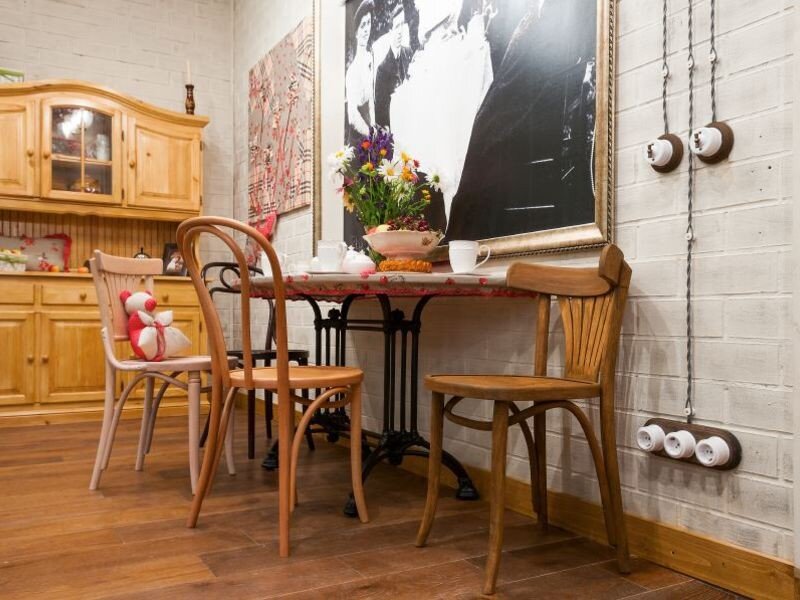 Винтажные трубы отлично сочетаются с наружной проводкой. Такой комбинированный метод позволит не отойти от инструкций для монтажа проводки, полностью выдержать стиль, и без ограничений пользоваться всеми благами современной цивилизации.