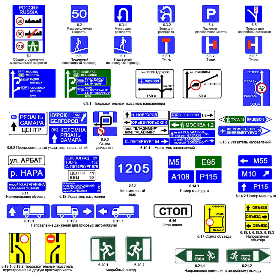 Знаки указывают направления движения к обозначенным на них населенным пунктам и другим объектам. Фон знака указывает водителю на какой дороге он находится (в населенном пункте, вне населенного пункта или на автомагистрале) или по какой дороге ему предстоит движение до обозначенного объекта.