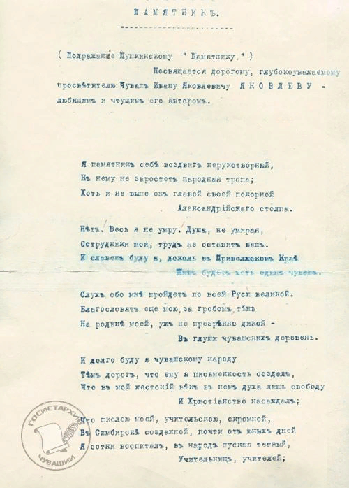 Один из ценнейших документальных памятников Архивного фонда Чувашской Республики - личный фонд И.Я. Яковлева, который хранится в Государственном Историческом Архиве Чувашской Республики. Одним из таких документов является «Памятник» Александра Владимировича Жиркевича 1919, подражание стихотворению А. С. Пушкина «Памятник». История и характеристика документов личного фонда И. Я. Яковлева Государственный Исторический Архив Чувашской Республики 2008