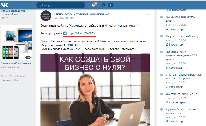 - Платная реклама. Эффективна при наличии минимум тысячи подписчиков. Наиболее распространенный вариант, который видел каждый – добавление неполного поста со ссылкой на паблик.