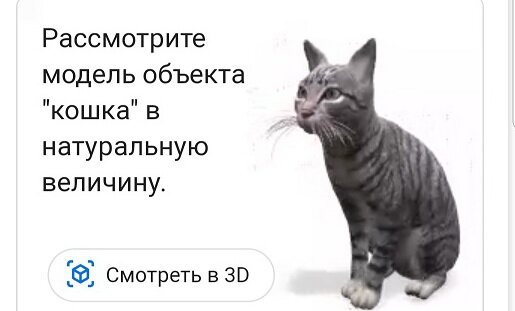 Как часто вы хотели завести себе щенка, но обстоятельства не позволяли? Или миленького котейку, но тоже не срасталось? Теперь вы можете завести у себя хоть леопарда...правда не живого, а 3d. Что нужно для этого сделать, если вы, например, хотите завести кота: 1. Набираем в гугл- поисковике слово "Кошка" 2. Первая статья будет из Википедии и чуть ниже будет указано: "Рассмотрите модель объекта "кошка" в натуральную величину" . Нажимаем "Смотреть в 3d". 3. Далее нажимаем "Посмотреть у себя" и движением телефона определяем поверхность у себя дома. Как только поверхность будет найдена, вы увидите животное прямо перед собой. Животное можно увеличить, уменьшить. Также можно подвинуть. Вы можешь встать с ним рядом и сфотаться. Таким образом вы можете завести собаку, енота, крокодила, панду, акулу и много других животных. Все они издают звуки и меняют позы. В общем вот что получилось у меня в ходе такого баловства помимо кошки: А самое главное кормить и ка-ка убирать не нужно! В общем дет