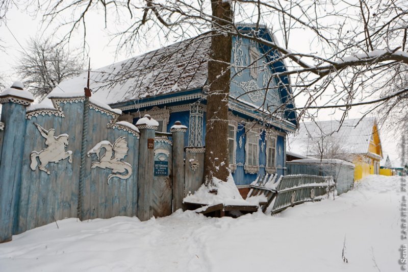 Все в этом доме сделано Владимиром. Образование плотника он не получал, обучался резьбе по дереву сам. Практически все в доме сделано из липы, т. к. она проще дается обработке. Золотистый глянец придает японская поталь, кот