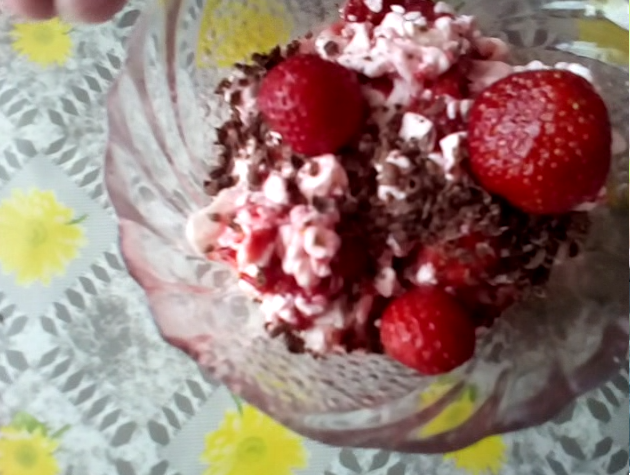 Берем творог, лучше зерновой, добавить к нему сливки или молоко, можно не густую сметану. добавить в клубнику сахар или сахарную пудру и подавить картофеле мялкой или вилкой, но не в пюре. Надо, чтобы кусочки клубники чувствовались целиком. Соединить клубнику с творогом. Украсить тертым шоколадом и целыми ягодами. Можно использовать малину, вишню или смородину. Состав произвольный, т.к. сахар или сахарную пудру добавить по вкусу, творог и ягода берутся любого количества, я люблю один к одному. Приятного аппетита!