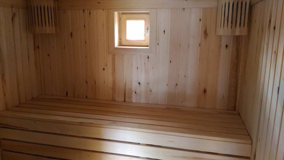С такой печкой парная прогревается до 80 градусов и держит тепло около 3-х часов. Полок в парной сделали из осиновых досок, прикрученных саморезами к каркасу. Осину покрыл Неомидом 200. Средние стойки каркаса специально утопили, чтобы ступни не запинались.