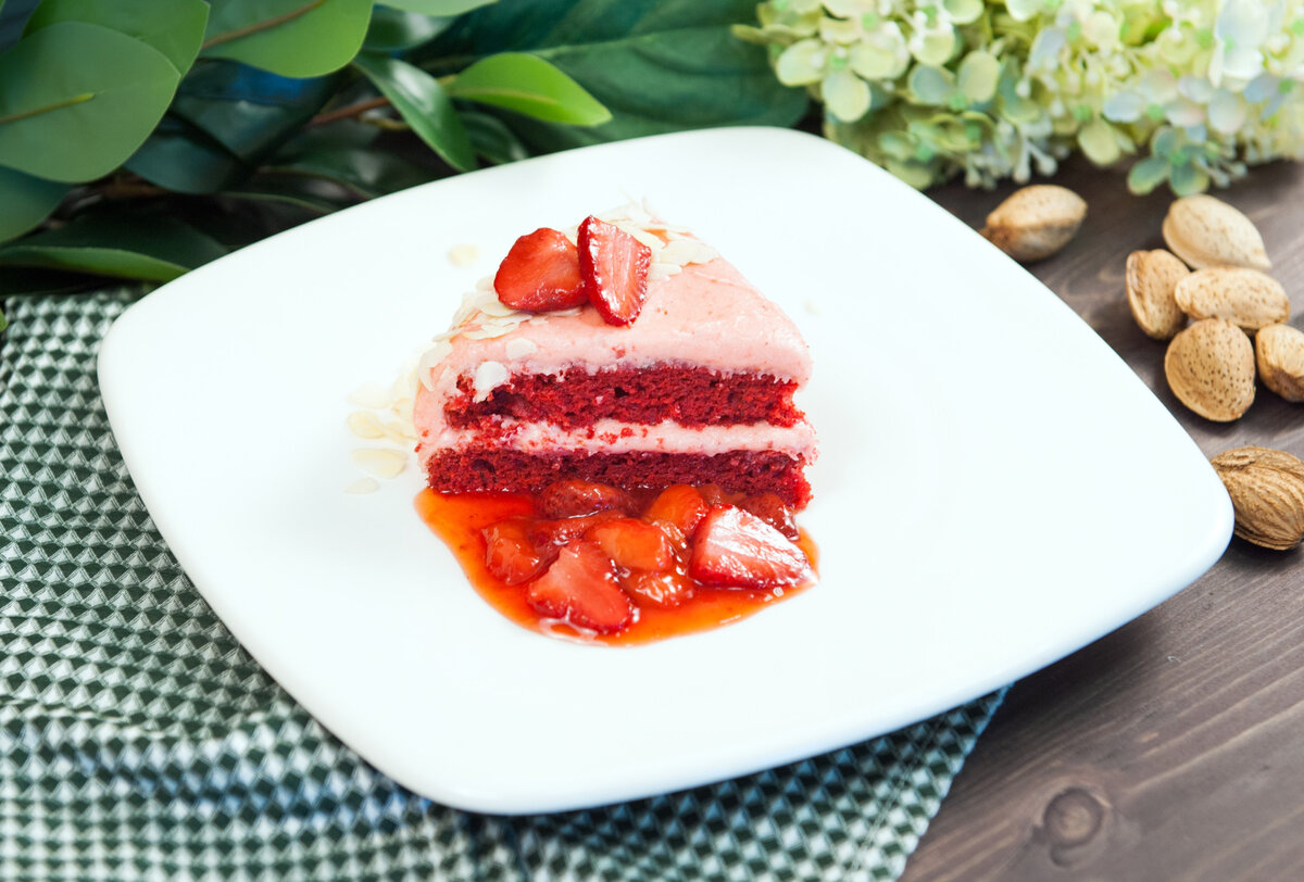 миндальные лепестки Способ приготовления: 1. Соединяем 200 г клубничного пюре, 1 ч. л. соды и 1 яйцо. Добавляем 1/2 ч. л. соли, 200 г сахара, 1 ст. л. яблочного уксуса и 200 г муки, перемешиваем. 2. Вводим 4 г какао и красный пищевой краситель, тщательно перемешиваем. Добавляем 80 мл растительного масла. 3. Дно форм застилаем пергаментом, выкладываем тесто. Отпекаем в духовке на 180 градусах 10-15 минут, остужаем. 4. 100 г клубники нарезаем некрупно, добавляем 50 г сахара и 100 мл воды. Доводим до кипения. 5. 1 ч. л. крахмала растворяем в воде, вводим в клубничную массу. Провариваем до загустения, даем остыть. Переливаем в миску. 6. Соединяем 60 г кокосового масла и 60 г клубничного пюре. Постепенно вводим 480 г сахарной пудры, взбиваем до пышности. 7. Коржи зачищаем. Наносим крем на первый корж, выкладываем второй корж и покрываем кремом полностью. 8. Посыпаем миндальными лепестками. Подаем торт с клубничным соусом. Приятного аппетита! Еще больше рецептов на сайте tveda.ru Любите чита