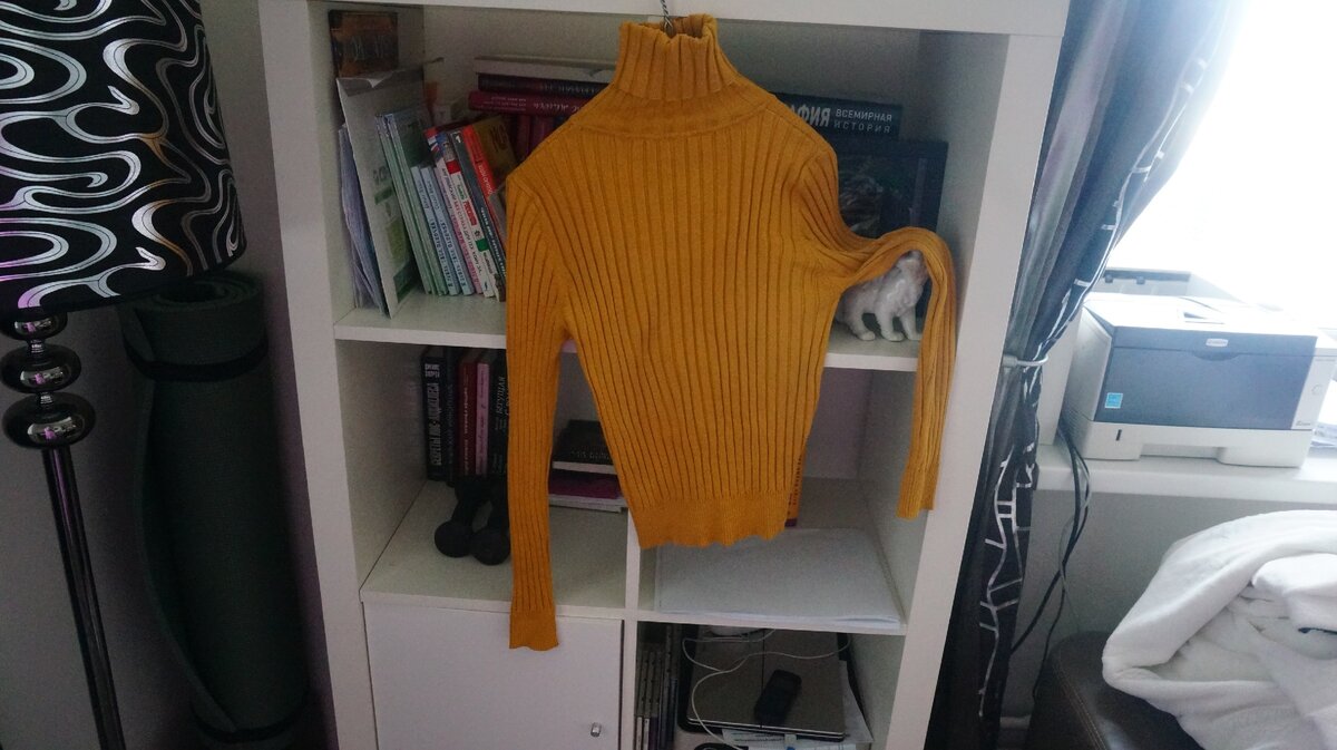 По факту оказалось, что он очень короткий. Понятно, что это такая модель, из тех коллекций, когда показывали голый пупок. Но я хотела носить водолазку под рубашку, однако не понимала, что она будет выделяться именно за счет того, что короткая. В общем, цвет, качество-все нормально, а вот длина явно не подошла. Я попыталась его вернуть, но в чеке этого свитера не оказалось. Я бы отдала его нуждающимся, но с этим тоже пока пришлось завязать по описанным ранее причинам. Поэтому, некоторое время он будет жить у меня дома, до тех пор пока не подарю его какой-нибудь маленькой девочке