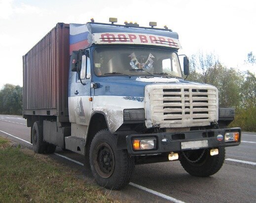 Предлагаю начать этот выпуск с необычного ЗИЛ-4331, который руками мастера был переделан в дальнобойный грузовик. Судя по названию на лобовом стекле, "Форвард", это наверное имя машины, которое ему дал водитель. Чтобы адаптировать машину к дальним рейсам, была увеличена высота крыши и удлинена сама кабина. Обтекатель окрашенный в российский триколор задает некую патриотичность. С торца наблюдаются жигулевские фары, которые закрывает тонировка. Вот ЗИЛ-131. Его внешний вид выглядит довольно странно и необычно. И быть может это не 131-й. Было дело, когда Зиловские кабины поставлялись на предприятие АМУР. Их усилиями производились ЗИЛки дорожной версии. И то, что на фото это скорее солянка. Тут присутствует длинная рама, дорожные задние ведущие мосты. Современная бортовая платформа и кран-манипулятор. Мост спереди не является ведущим и кабина толи от ЗИЛ-131, толи АМУР. Длинный капот этого грузовика напоминает ЗИЛ-133ГЯ. У такого капотного грузовика с выпуклой решеткой радиатора, явно рук