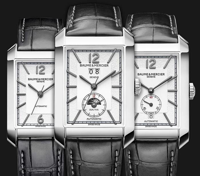 Прямоугольные часы получили наибольшую популярность в начале прошлого века, но и в наше время их элегантность сложно оспорить. Baume et Mercier представила новые версии своих прямоугольных часов из коллекции Hampton. Коллекция во многом вдохновляется эстетикой направления Ар Деко, которое зародилось во Франции в 1920-х годах. Из новинок можно выделить “трехстрелочник” Hampton Automatic (10522), модель с малой секундной стрелкой и датой Hampton Automatic Small Seconds/Date (10528) и версию с большой датой и вторым часовым поясом Hampton Automatic Big Date/Dual Time (10523). Baume et Mercier Hampton Automatic (10522) Самая простая модель из представленных имеет прямоугольный корпус среднего размера 43 мм х 27.5 мм. Толщина 10 мм. Материал корпуса нержавеющая сталь с полированными поверхностями. Плоская заводная головка на правой стороне. Задняя крышка имеет круглое окошко с сапфировым стеклом и закреплена на 4 винтах. Есть возможность персонализировать заднюю крышку – при помощи гравиро