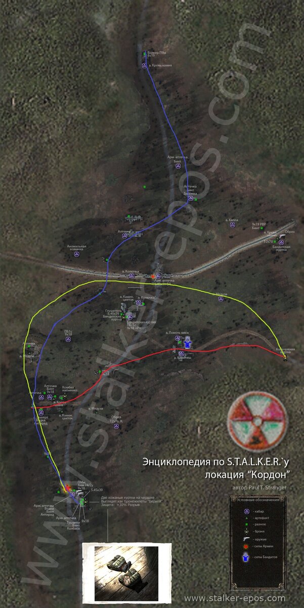 Приветствую читающих. Сегодня я запустил свой сталкач и решил проверить, сколько я смогу заработать там бабла за час двигаясь по мейн квесту. Играл я на стим версии, соответственно там стоит последний патч и отсутствуют моды. Не очень торопился, но старался быстрее все пробежать. Свои маршруты я буду проводить линиями Красная начальная, зеленая обратная, синяя на выход. Использую карты с EPOS. Кордон Начало как обычно, подобрать все артефакты в округе деревни, замочить бандитов соло, забрать куртку в тоннеле и каменный цветок на заводе + военные + тайники и квесты на доставку артов. Вышло все с продажей сразу же Сидоровичу примерно 25-30к деревянных на кордоне. Артефактов мало, врагов много, оружие дешевое, много не заработать. Потерял на это примерно 10-13 минут. Разжился калашами, вальтером и комбезом наемника +30000 в кармане Свалка Тут уже попроще и побогаче. Игнорируем бичей на начале локации, смещаемся резко в сторону левой рощи с аномалиями. Отстреливаем местных бандитов и л