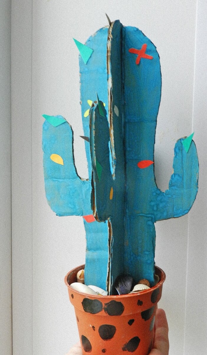 Приступим. Для начала приготовим наш горшочек. Можно украсить его скотчем или разрисовать красками. Мы нарисовала маркером горошки. А теперь наш колючий дружок. Рисуем произвольно две одинаковые детали кактуса. По середине проводим линию не до конца. После того как все вырезали и разрезали, необходимо их соединить, вставив друг в друга с помощью разрезов по середине. И вуаля наш кактус готов...почти :) Приступаем к декорированию, моё любимое! Мы покрасили основу зеленой гуашью, вырезали из обрезков разные фигуры и приклеили в хаотичном порядке. Теперь нам нужно поставить наш кактус в горшочек и чем нибудь его заполнить, у меня это будут маленькие ракушечки, вы можете использовать камешки или крупную крупу. Наш колючий дружок готов! Ставим на видное место и любуемся...любуемся...любуууемся! :) Большое