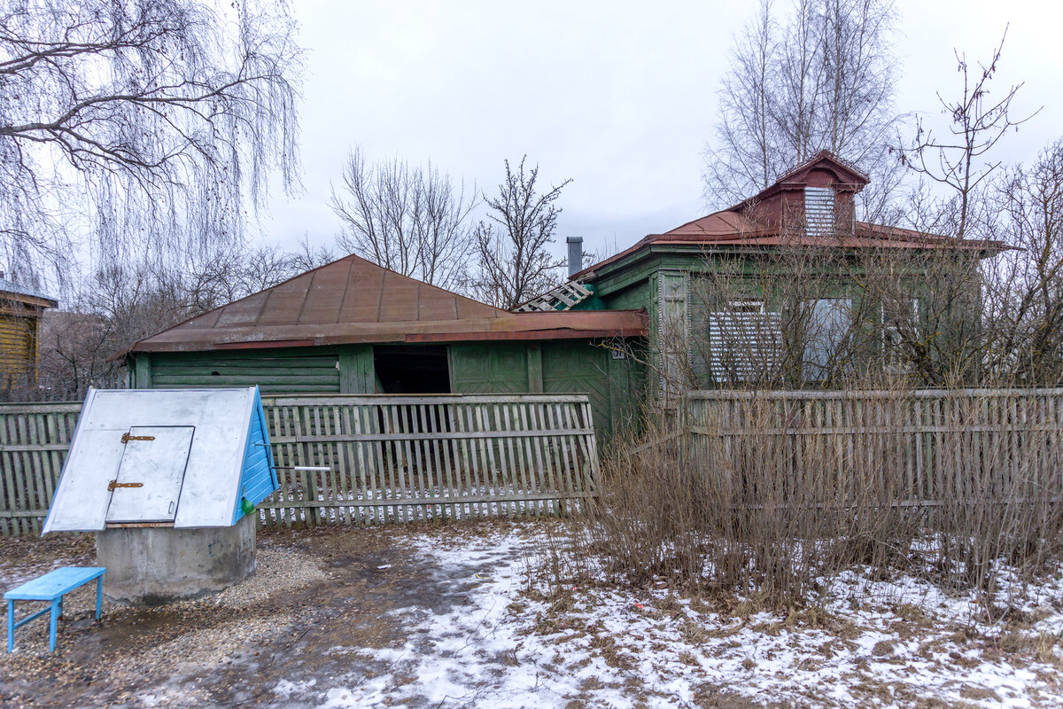 Этот старый дом я впервые увидел более двух лет назад. Уже тогда он был заброшен, но расположение в тихом тупике где почти не ходят посторонние, длительное время спасало его от полного разрушения и растаскивания мародёрами. Они, а ещё сборщики металлолома о нём просто не знали, зато о доме знал местный бомж. Он частенько ночевал в нём в тёплые летние дни, подогнав интерьер под свой вкус. В начале весны я узнал что дом в скором времени будет снесён ради строительства некоего нового здания. Возможно это уже произошло, я пару месяцев как не был в тех краях из-за коронавирусных ограничений. Несмотря на поваленный во многих местах забор, выбитые двери и забитые металлическими листами окна, снаружи дом выглядит довольно прилично. Обратите внимание на планировку. Слева расположен бревенчатый сарай с треугольной крышей, с домом он объединён массивными деревянными воротами. Пространство между сараем и домом сверху прикрыто навесом. В окрестных деревнях некоторые из подобных ворот, украшены