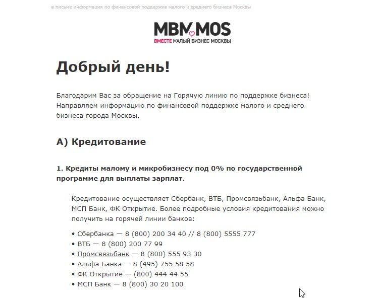 Обещания по поддержке малого бизнеса меня, конечно, обнадеживают, но вот тут пришла пора воспользоваться... Кто сказал, что отрасль по разработке и поддержке сайтов не пострадала? У моих потенциальных клиентов снизилась платежеспособность. Услуги то может быть и требуются, но платить за них смогут? В моей организации, которая занимается созданием и продвижением сайтов, есть неоплаченные счета контрагентов, а ежемесячные платежи и зарплату никто не отменял. Мне нужна помощь, также, как и многим. Обращаюсь с вопросом на горячую линию по поддержки бизнеса MBM.MOS - в ответ получаю письмо с рекомендаций по кредитам и субсидиям. Кредиты, конечно же на первом месте в большом объеме. Сначала по субсидии: я попадаю только под субсидию на помещение. Вы серьёзно? Помещение под офис в самоизоляции? Это не навязывает траты, которыми нельзя воспользоваться? Хорошо, опустим, нет для меня субсидий. Зато поддерживаю иностранные франшизы и технопарки на экспорт. Так то вот. Свое не в престиже, да