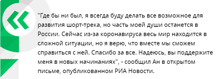 Российский шорт-трекист Виктор Ан заявил о своём решении завершить карьеру. По словам спортсмена, его текущая форма не позволяет выступать на должном уровне. Возраст (34 года) всё-таки сказывается. Победы Ана Спортсмен является 6-кратным Олимпийским чемпионом. 3 золота он выиграл в составе сборной Кореи (его тогда звали Ан Хён Су) в 2006 году в Турине и 3 золота в составе уже сборной России (как Виктор Ан) в 2014 году в Сочи. Кроме того, Виктор Ан 20 раз становился чемпионом мира по шорт-треку, а его приход в сборную России позволил другим нашим спортсменам выйти на совершенно иной уровень, став одними из законодателей мод в мировом спорте. Напомним, что в своё время федерация Южной Кореи отказала в помощи спортсмену, после чего он решил выступать за российскую сборную, которую вывел на небывалые для себя высоты. В СОЧИ Ан выиграл забег на 500 метров, 1000 метров и эстафету в составе сборной России. Увы, но на игры 2018 года Виктора Ана не позвали. Хотя при этом его никогда не уличали
