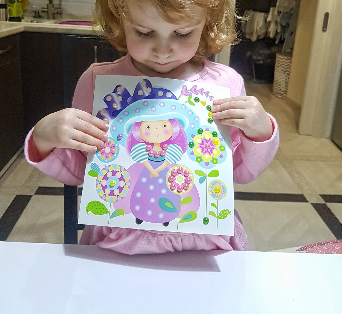 Дети обожают наклейки, а сегодня мы выбрали набор с жемчужными бусинками. Этот набор мы купили в соседнем канцелярском магазине. Небольшое лирическое отступление. Когда я была маленькая, я просто обожала канцелярский отдел в соседнем книжном магазине! Все карманные деньги могла там оставить! Я часами бродила между стеллажей, изучала ассортимент, а моё воображение придумывало всякие интересные штуки, которые можно сделать из того, что там продается! Вы наверное уже догадались, что когда я попала в магазин Леонардо (это хобби гипермаркет в Москве) я провела там примерно пол дня! Поэтому у меня дома пол шкафа всяких бусинок, ленточек, цветной бумаги и т.д. для поделок и творчества! Ну так вот, сегодня мы с Евой приклеивали жемчужные бусинки на фею из набора. Когда мы открыли коробку, там оказались только кусок картона с изображением феи и небол