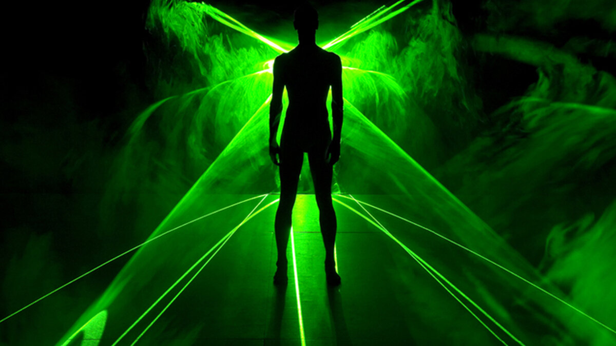 — где лазерные лучи видимые по всей длине, в дыму, разрезают пространство и строят абстрактные иллюзии;