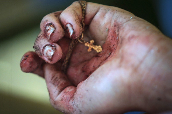 Одна из учениц бесланской школы, Виктория Кцоева, которая оказалась в числе заложников и была ранена, держит в руках крест, находясь в госпитале в Беслане. 3 сентября 2004 года
