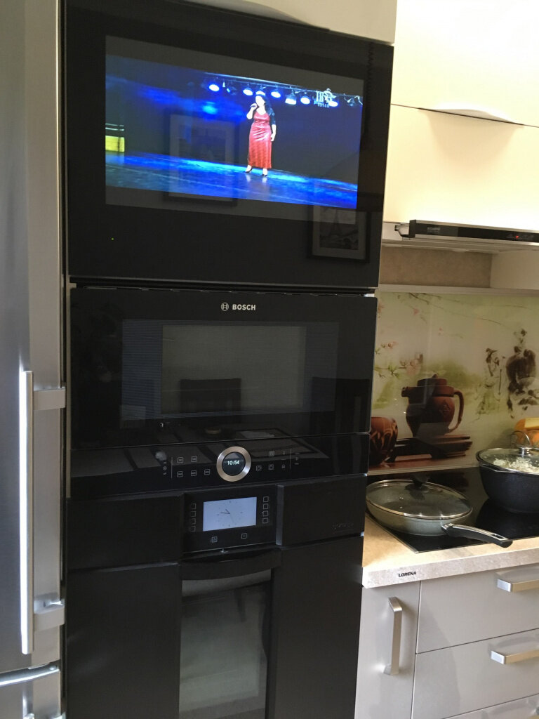 - расположение телевизора в «колонне» или в едином блоке с прочей встраиваемой кухонной техникой (духовым шкафом, микроволновкой, кофеваркой);