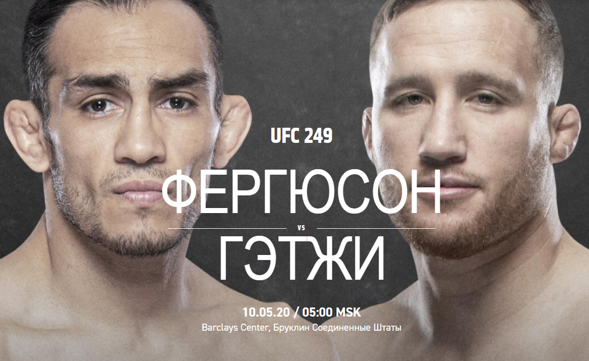 Турнир UFC 249 пройдет 10 мая в Бруклине на VyStar Veterans Memorial Arena. В главном бою Тони Фергюсон и Джастин Гейджи встретятся за временный пояс легкого веса. Изначально турнир должен был пройти 19 апреля в Нью-Йорке и за пояс чемпиона должны были встретиться действующий чемпион дивизиона Хабиб Нурмагомедов и американец Тони Фергюсон. Но пандемия коронавируса внесла свои правки в планы UFC - турнир отменили. Между делом была целая эпопея по поводу участия и замены Хабиба, итогом которой стало, что Хабиб не мог вылететь из России из-за распространения вируса и ограничительных мер. Сейчас уже наступил месяц Рамадан, в ходе которого Нурмагомедов не выходит в октагон.
