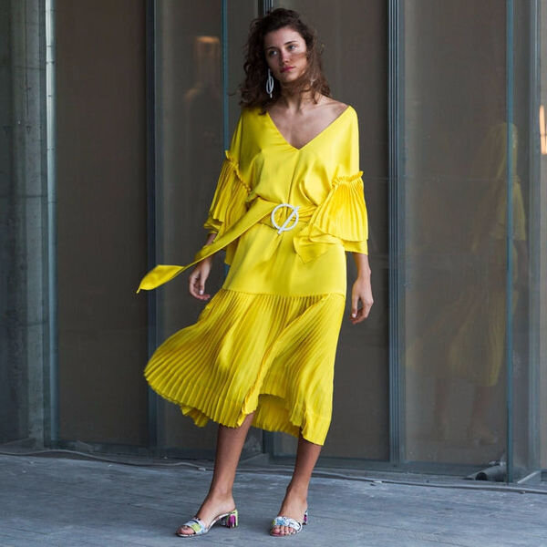 Необычные street style образы: лимонное платье, полосатая блузка и бордовые мюли