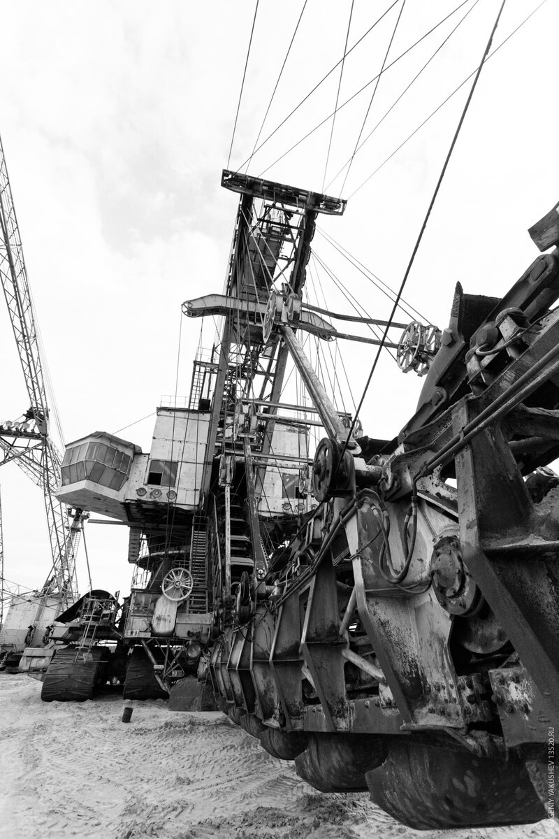 Про огромные экскаваторы величиной с дом знаю уже давно, спасибо Discovery. А недавно увидели их воочию близ Воскресенска. На самом деле попытка доехать до них была еще зимой на маленькой Ауди, но колея 20 см и приближающиеся сумерки отложили эту идею до лета. Наступили теплые дни, я обзавелся внедорожником и мы выехали в путь. Дорога от центра Москвы занимает около трёх часов. Самое интересное начинается на подступах - абсолютно разбитая дорога(из положенных поперек бревен), рвы, канавы, ямы, огромные грязевые лужи. Последний километр проехать на стоковом внедорожнике не решился, пошли пешком. Рядом в лесу стояли такие же брошенные авто туристов, а вокруг развешены рекламные таблички "ДжипХелп". Выйдя из леса к дороге на карьер, увидели этих двух исполинов. Подойдя ближе, нас встретили охранники предложив провести экскурсию за 100 руб с чел. Мы, конечно же, согласились! Очень интересно было послушать историю от человека работавшего в бригаде абзетцера со дня открытия выработки и