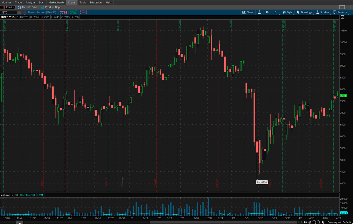 Итак, сегодня фьюч биткоина на CME добрался до 7900$, прибавив ещё 2%, хотя сравнительные объёмы в этом месяце, конечно, не сильно подтверждают этот рост. Тем не менее, в прошлый четверг биткоин вышел из коррекции, подтвердив пробоем восходящий тренд после разворота 17.03: