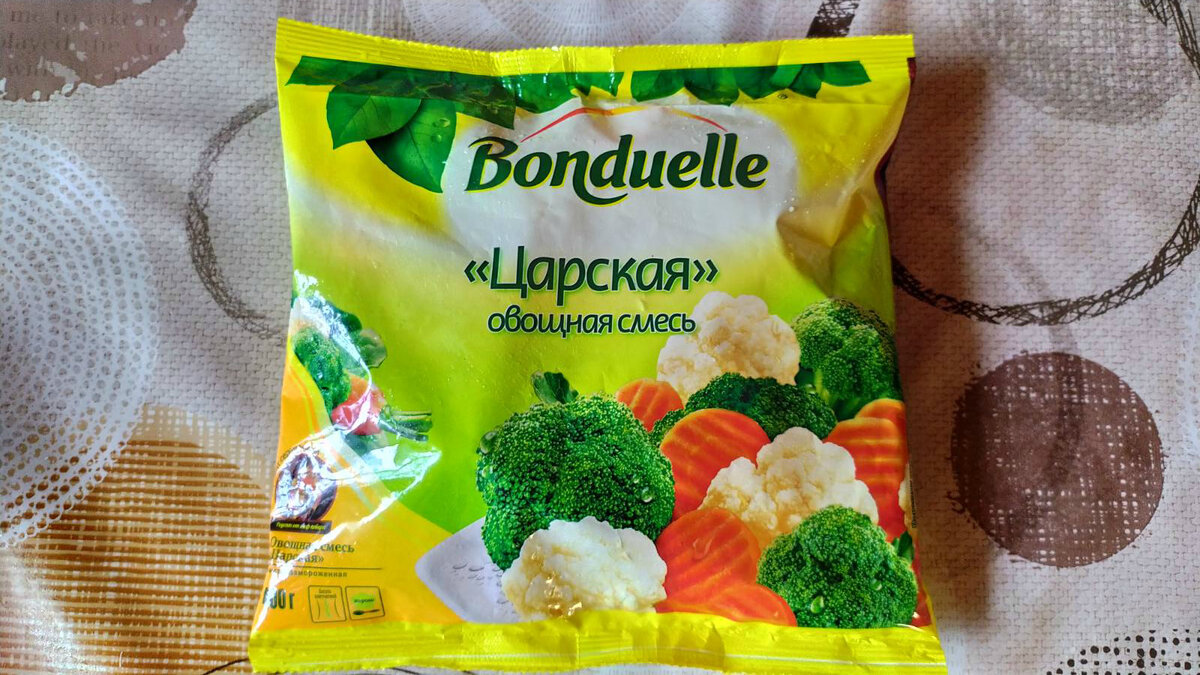 Сейчас на прилавках магазинов очень много различных замороженных овощных смесей. В условиях большой занятости и отсутствием времени на долгое приготовление это настоящая палочка выручалочка. Сегодня будем готовить из овощной смеси бондюэль "Царская" 400 г. А какой марки овощную смесь вы чаще всего используете? Напишите пожалуйста в комментариях. Немного о составе: 1. Цветная капуста 40% 2. Брокколи 30% 3. Морковь 30% на 100 гр. продукта: белки 1,4 гр , углеводы 5,5 гр. , жиры 0,4 гр. Клетчатка 2,8 гр. Энерг. ценность 25 ккал. Овощи перекладываем из пакета и промываем под проточной водой. Кроме овощной смеси нам потребуются следующие ингредиенты : 1. Куриное филе 300-400 гр. 2. Перец сладкий 1 шт. 3.Лук репчатый 1 шт. 4. Специи : Орегано, розмарин, шалфей, соль, перец по вкусу. Лук нарезаем полукольцами и обжариваем до золотистой корочки. Перец нарежьте мелким кубиком. Филе необходимо промыть и порезать маленькими ломтиками. Соединяем овощную смесь и другие ингредиен
