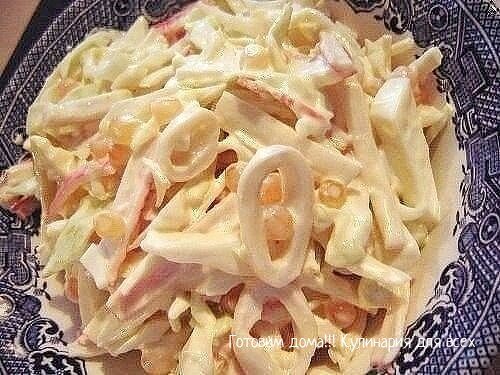 Количество ингредиентов можно брать по желанию. Кальмаров отваривают, лук режут четверть