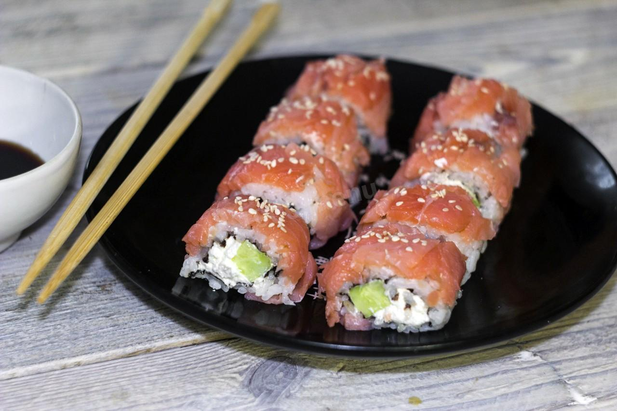При помощи той же циновки сворачиваем ролл и ножом, смоченным в воде аккуратно нарезаем ролл на 6-8 частей