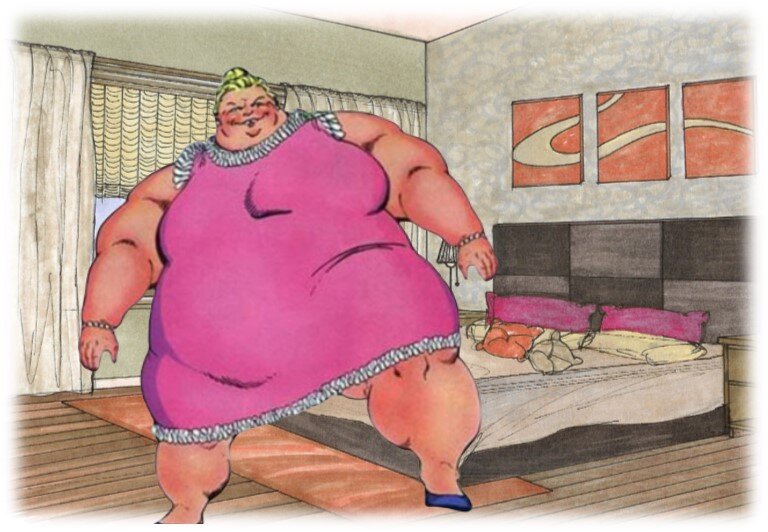 Бросив неизменное: «Пока», Ольга положила трубку на стол и удовлетворённо улыбнулась. Затем, подумав о чём-то несколько минут, с неописуемой грацией понесла своё стасорокакилограммовое тело в спальню... подошла к кровати и та, обречённо крякнув, привычно раскрыла свои объятия навстречу хозяйке... Ольга легла на спину, подложила под голову пышные, как деревенская булка руки и закрыла глаза. Губы вновь тронула лёгкая улыбка. Полежав так совсем немного, она повернула голову влево и обратилась к невидимому нами собеседнику: