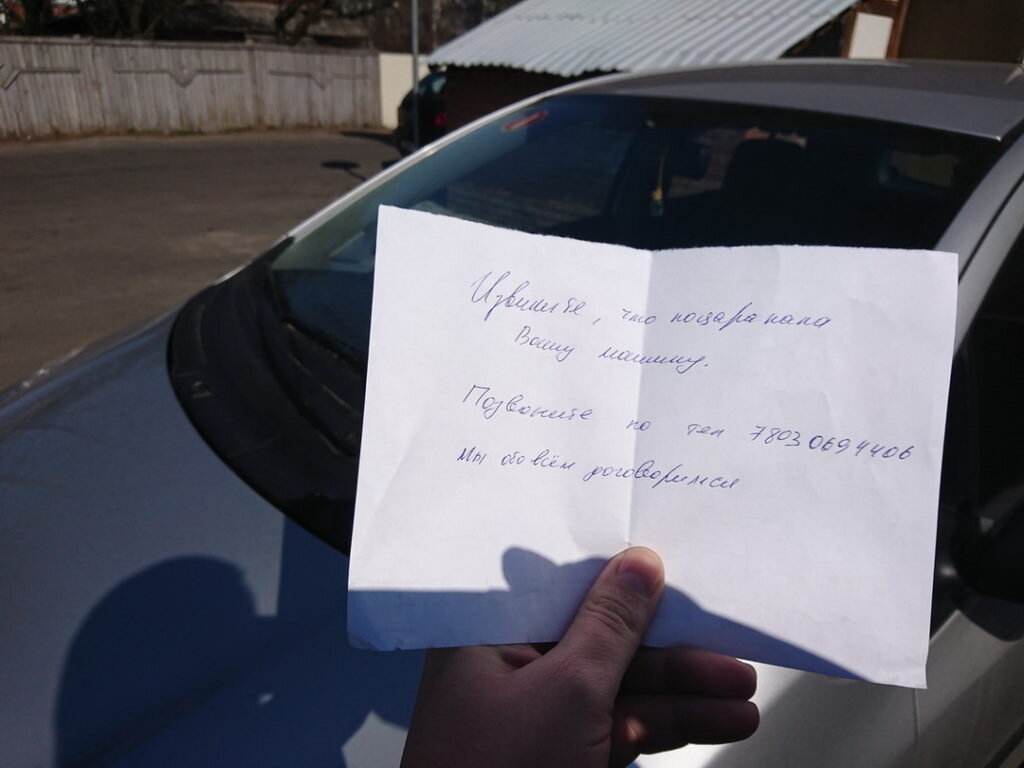 В больших городах не всегда возможно найти парковочное место, и приходится ставить автомобиль в неположенном месте, например, вы можете перекрыть кого-то на парковке или заехать частично на тротуар. Для того, чтобы оперативно связаться с нарушителем, который перекрыл дорогу, он оставляет на лобовом стекле табличку со своим номером телефона. Чем и начали пользоваться мошенники. «Алло, я немного задел ваш автомобиль» Доверчивого человека легко развести на деньги. Еще одна разводка — это записка с номером телефона и примерным содержанием: «Извините, что поцарапал вашу машину! Мне пришлось срочно уехать, но все вам компенсирую. Просто позвоните по номеру и все решим!» Вроде логично, вот не просто поцарапали, а записку с номером оставили. Что делает жертва? Правильно, звонит! Именно так начали разговор, когда я позвонил по номеру телефона, оставленному на лобовом стекле автомобиля. Дальше мне сказали следующее: — Я немного задел ваш автомобиль, но я сильно опаздываю, поэтому мне п