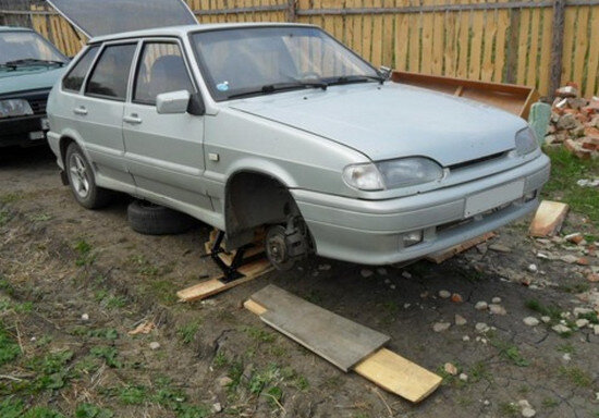 Первым делом нужно поддомкратить и укрепить автомобиль, чтобы выставить переднюю ось в подвешенном состоянии.
