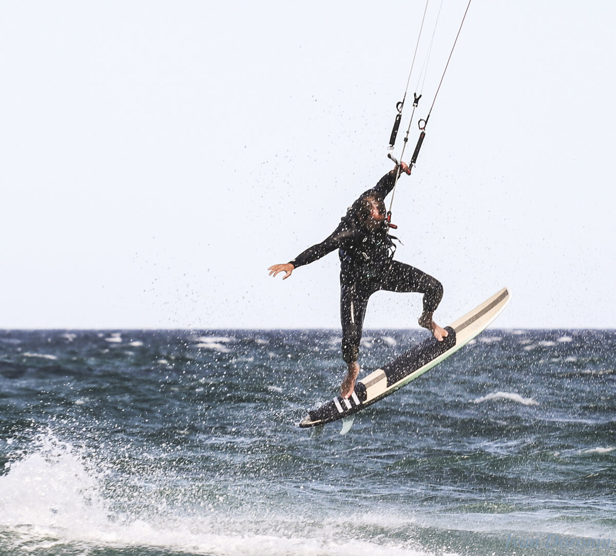 Вам нужно хорошо проанализировать флот, его уровень, прежде чем начинать стартовать там. Возможно, после анализа ситуации вы решите стартовать чуть ниже, но с более чистым ветром, и тогда вы выиграете по скорости, ведь при старте у правого знака существует большая вероятность того, что ваш кайт спутают, и вы вообще не сможете стартовать. На мой взгляд, такой вариант стартовой линии самый неблагоприятный. На третьем рисунке левая сторона стартовой линии является наиболее выгодной. Если стартовая линия достаточно длинная, многие спортсмены будут стартовать левым галсом. Такой старт будет лучшим вариантом, если, конечно, он получится у вас и вам не помешают гонщики на правом галсе. Еще одним минусом здесь будет «выход» на лейнлайн (поворот на знак в правильном месте), ведь вы будете далеко от знака, и цена ошибки будет достаточно высокой. Если повернете раньше, то придётся делать два лишних поворота, а если затянете с поворотом, то потеряете драгоценные секунды и преимущество старта левым