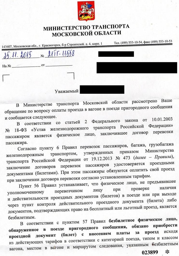 Полезная лазейка №2. Пожалуй, самая грамотная дыра, после прямого осознания того факта, что билеты Вы никому не обязаны предъявлять вообще в электричках. Существуют Правила перевозки пассажиров железнодорожным транспортом, утверждённые приказом Министерства транспорта РФ от 19.12.2013 №473. И в них есть очень приятный пункт №59, в котором говорится, что: «безбилетное физическое лицо, совершившее посадку в поезд пригородного сообщения в пункте отправления, где отсутствуют или не работают железнодорожные кассы и(или) платёжные терминалы, обязано оплатить стоимость проезда в вагоне или после окончания поездки в пункте назначения…». Очень качественно можно использовать, если Вы не хотите покупать билет именно у кассиров-контролёров, и хотите более грамотно их слить. В дополнение можете использовать письмо из Министерства транспорта (тыкать в него кассиров-контролёров), что подтвердило данный нюанс правил: