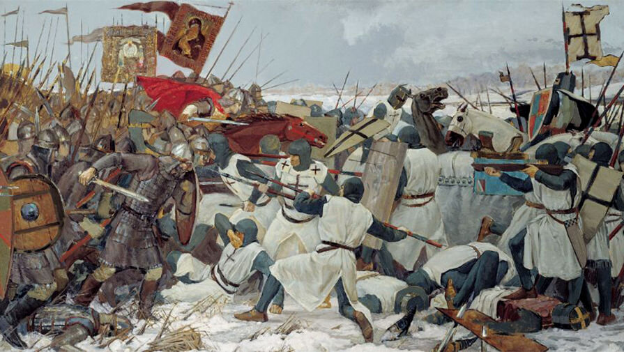 Земля русская хранит память множества битв, случавшихся за ее многовековую историю. И в каждой находились герои, о которых слагали легенды, передаваемые от отца к сыну, от деда - к внуку. Это были и рядовые солдаты, и бравые офицеры, и покрытые славой военачальники, и простые ополченцы. Могилы русских солдат-освободителей есть и в Европе, и на Балканах, и в Америке. И Россия помнит своих Героев. О них наш рассказ. Ледовое побоище В сражении, произошедшем на Чудском озере в апреле 1242 года, названном впоследствии «Ледовым побоищем», сошлось два воинства – закованные в тяжелые железные доспехи германцы, рыцари Ливонского ордена, и русское войско, собранное князем Александром Невским. Получив сокрушительные фланговые удары, германцы отступили. Русские дружины преследовали бегущих по льду в тяжелых доспехах немецких рыцарей на протяжении семи верст. Так русичи одержали уверенную победу и прославили имя Александра Невского. В 1243 году Ливонский орден запросил мира. Вместе с победами княз