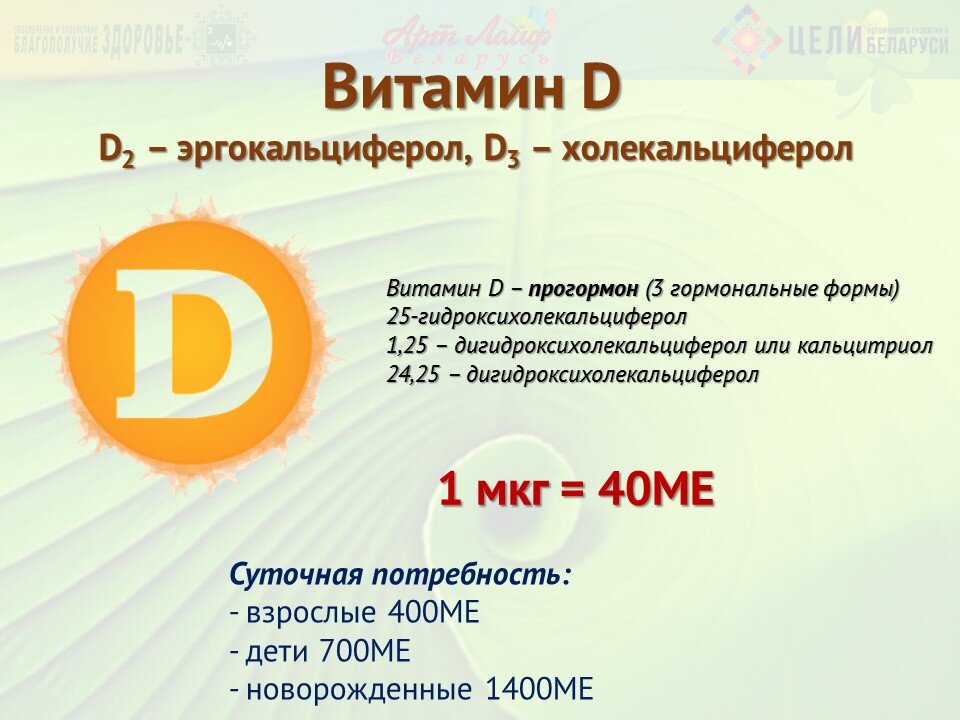 Витамин D – необходимое вещество для правильного функционирования множества систем организма. Часть вещества может синтезировать кожа самостоятельно при загаре – образованию витамина способствует облучение кожных масел светом. Соединение имеет жирорастворимую структуру, поэтому желательно избегать передозировок – удалить излишки вещества через почки не получится. Опасен и недостаток группы витаминов D, так как в данном случае может пострадать прочность скелета и развиться множество опасных заболеваний. При недостаточном пребывании на солнце рекомендуется дополнительно принимать витамин в составе БАДов.