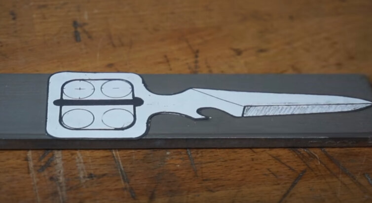 Добрый день дорогие друзья. Сегодня мы с вами изготовим очень нужную и полезную вещь которая всегда будет с вами. Это будет пряжка для поясного ремня, но с секретом. Она будет выполнять три функции. Собственно, пряжки, ножа и открывалки для бутылок. Согласитесь, иметь такую универсальную пряжку - это значит всегда быть готовым к любой ситуации. И начнем наше изготовление с чертежа заготовки, который нужно сделать в натуральную величину и перенести его на металл. В нашем случае изготавливать пряжку мы будем из нержавеющей стали, но можно использовать и другой металл с хорошими характеристиками, только впоследствии он должен пройти процесс воронения. Итак, наносим контуры на металл и приступаем к обработке. Основным инструментом будет угловая шлифовальная машинка с отрезным диском. Нужно напомнить о том, что при данных операциях необходимо соблюдать правила техники безопасности. Также придётся поработать шлифовальными головками разного диаметра и, в некоторых случаях, обычным напильником