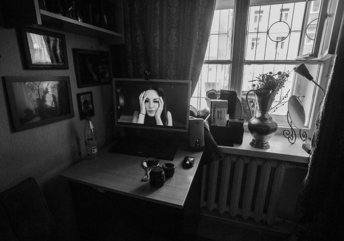 «Я снимаю русскоговорящих людей, которые находятся в частичной или полной самоизоляции в любых уголках мира. Делаю концептуальные съемки, в которых подчеркиваю хрупкость связи, пиксельность. Я созваниваюсь с людьми по „Скайпу“ или в любом другом мессенджере и говорю им, как встать, куда посмотреть, как повернуть камеру, а затем снимаю экран своим фотоаппаратом «Фуджи». Такие съемки позволяют мне немного зарабатывать и параллельно готовить свой большой проект „Хроники нового космополитизма“.