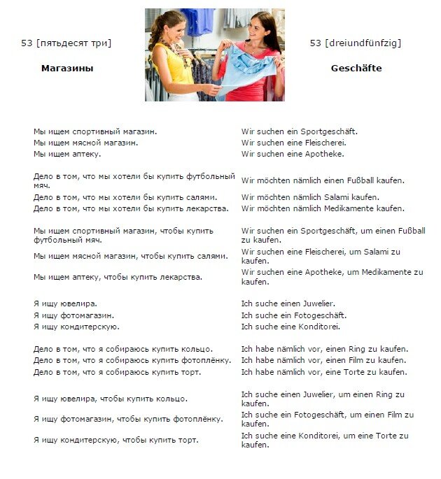 Немецкий язык. Урок 1. Немецкий язык. Урок 52. Добрый день! Продолжим изучение немецкого языка. Немецкий язык. Урок 53. 53 (пятьдесят три) - 53 (dreiundfünfzig) Магазины - Geschäfte Мы ищем спортивный магазин. - Wir suchen ein Sportgeschäft. Мы ищем мясной магазин. - Wir suchen eine Fleischerei. Мы ищем аптеку. - Wir suchen eine Apotheke. Дело в том, что мы хотели бы купить футбольный мяч. - Wir möchten nämlich einen Fußball kaufen. Дело в том, что мы хотели бы купить салями. - Wir möchten nämlich Salami kaufen. Дело в том, что мы хотели бы купить лекарства. - Wir möchten nämlich Medikamente kaufen. Мы ищем спортивный магазин, чтобы купить футбольный мяч. - Wir suchen ein Sportgeschäft, um einen Fußball zu kaufen. Мы ищем мясной магазин, чтобы купить салями. - Wir suchen eine Fleischerei, um Salami zu kaufen. Мы ищем аптеку, чтобы купить лекарства. - Wir suchen eine Apotheke, um Medikamente zu kaufen. Я ищу ювелира. - Ich suche einen Juwelier. Я ищу фотомагазин. - Ich suche ein Fotoges