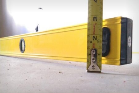 Минимальная толщина слоя 3-5 сантиметров, сначала выставляем крайние маяки, потом середину натянув шнурку, ну либо по лазерному уровню, если такой есть у вас в наличии)