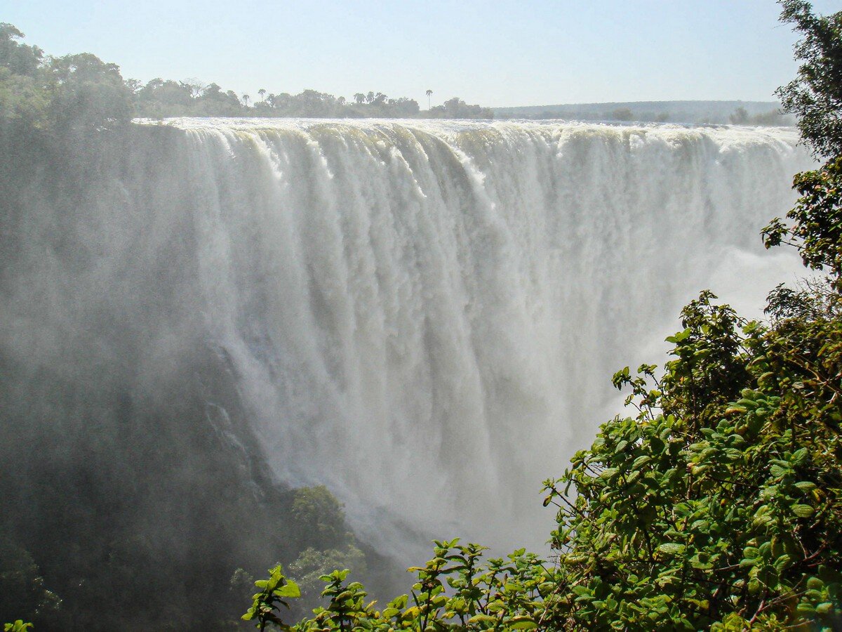 Вид сбоку, вдоль всего водопада: Поток внизу -> Угадайте что в каком году снято? Бурная Замбези-май-2008 - и вполне скромная в январе-2020. Вид с моста: Облако от водопада, вид с разных сторон: А теп