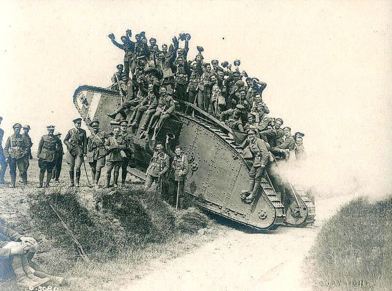 Классические английские танки-монстры На фото танк МК-4. Не все знают, что именно благодаря России танкам дали название «танк» (англ. tank). Изначально это слово не означало бронированную боевую машину как сейчас, а значило лишь то, что понималось под словом tank в английском языке – т.е. «цистерну» или «бак». В этой путанице «виновата» секретность. Во время Первой мировой войны английское командование не могло допустить, чтобы информация о первых «сухопутных судах» отправляемых союзникам оказалась в распоряжении Германии. Поэтому распространялась информация, что это мобильные водяные резервуары, цистерны для нужд фронта, а в некоторых источниках говорится, что даже уточнялся получатель – Российская Империя. На них даже писали "На Берлин" "Осторожно. Петроград" Гусеничная машина Besta, США (1917) Американский гражданин по фамилии Бест, построил эту уникальную машину, похожую на переврнутую лодку. Вес танка составлял 15 тонн. В 1915 году машина прошла удачные испытания и была при