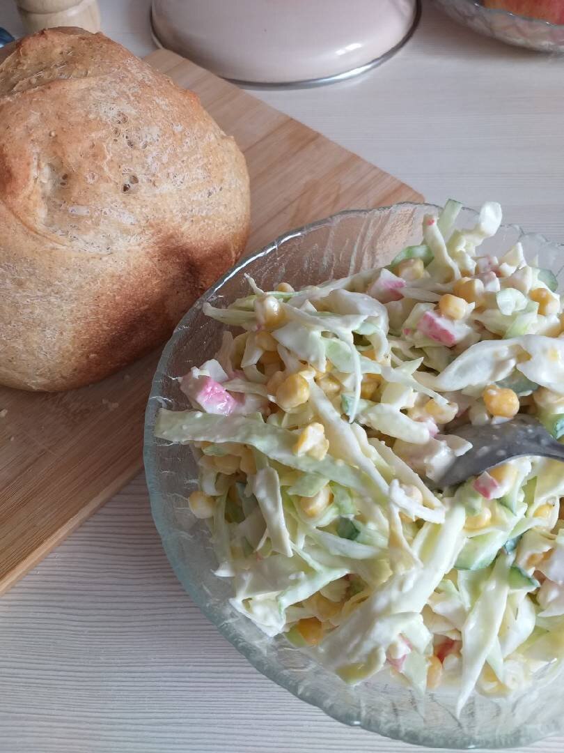 - Перемешиваем майонез и сметану. Заправляем наш салат. Перемешиваем. Даем настояться минут 30.