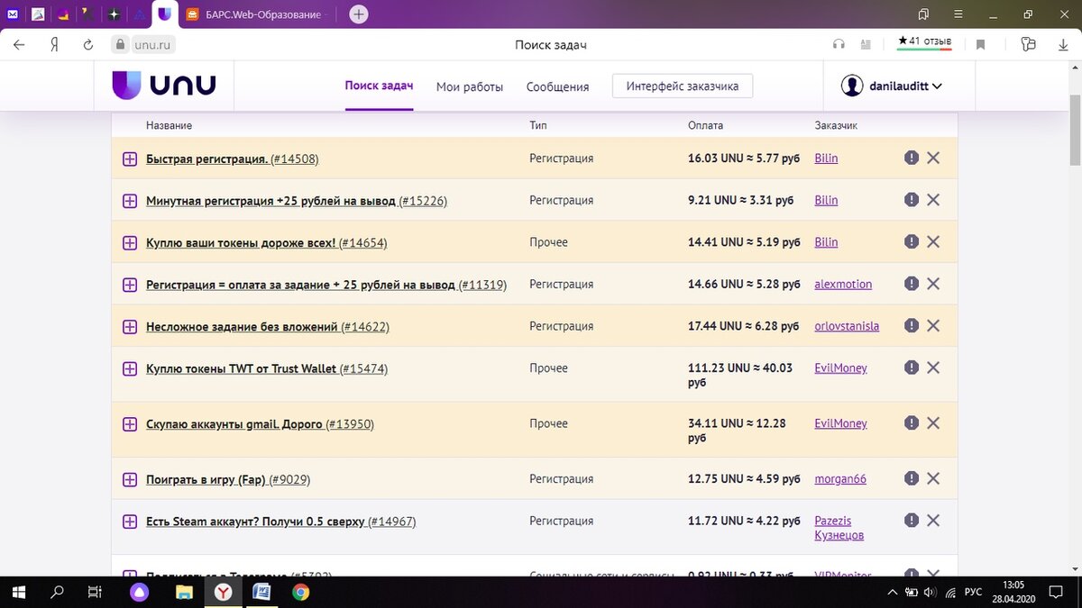 вот ссылка на сайт https://unu.ru/re/171662 переходите по ссылке , регестрируйтесь, привязывайте почту , и вам доступны задания их очень много за выполнение задания вам дают вознаграждение от 0.1-117рублей это только что я пока видел и практиковал вывод приходит без обмана за ден можно заработать примерно 500 рублей, это лучше чем ничего, тем более сейчас карантин. выводдить можно на карту,киви и многое другое . вот примерно какие задания там: вот задания легкие никакой сложности не вызывают, все очень просто и легко. буду рад если вы поставите лайк и подпишитесь на мой канал