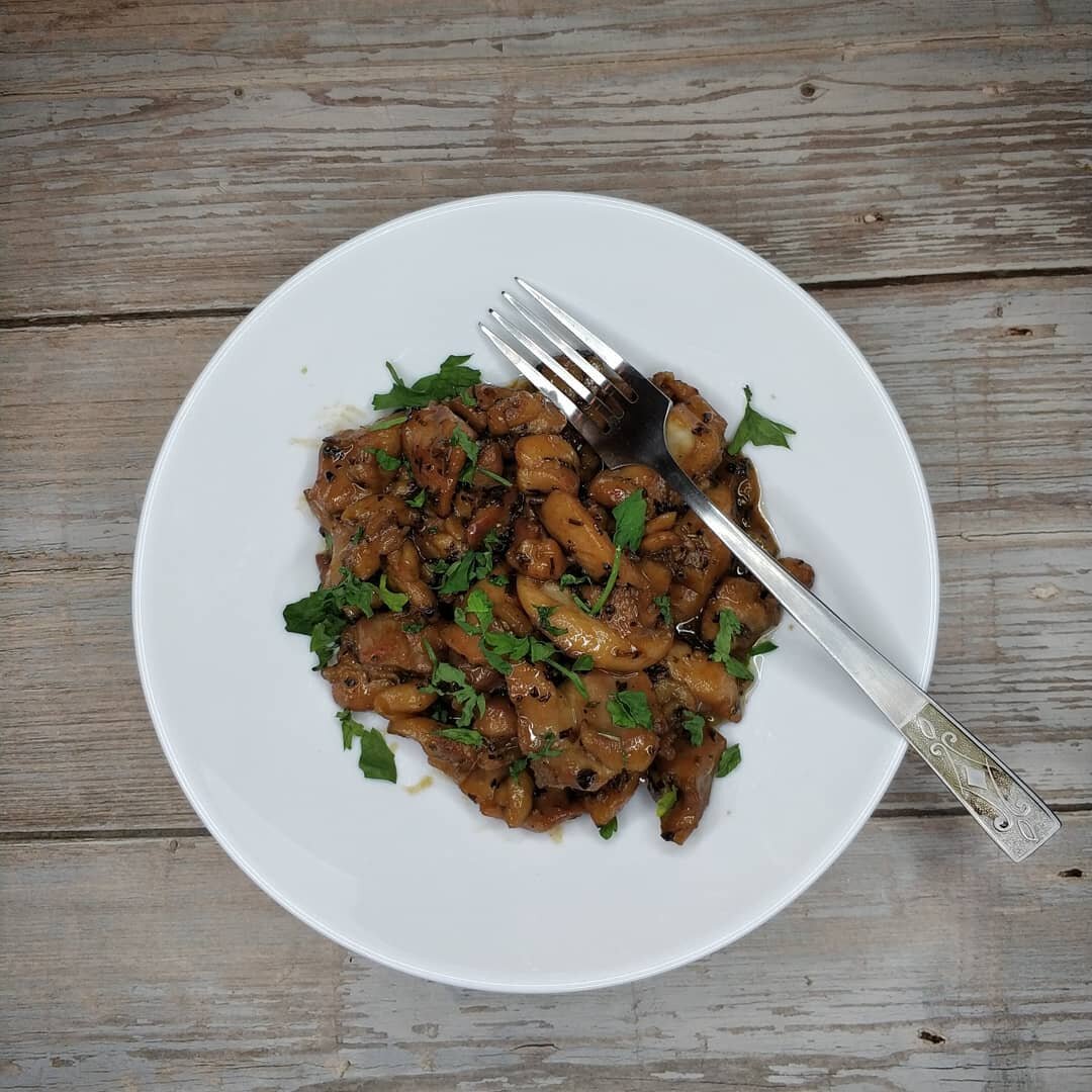 -Кунжутное масло (лучше темное) - 2-3 с.л. Курицу нарезать на кусочки и засыпать на 30 минут содой. Нарезать мелко имбирь и чеснок. Промыть мясо и просушить. Жарить на сильно разогретой толстостенной сковороде (лучше вок), если сковорода не большая то готовить частями - главное чтобы сковорода не успела остыть при добавлении мяса. Наливаем масло и имбирь с чесноком. Обжариваем 5-10 секунд. Добавляем курицу - обжариваем 20 секунд. Добавляем все остальное, перемешиваем, снижаем огонь на минимум, накрываем крышкой и томим 10 минут до готовности, в конце добавляем листья базилика и перемешиваем. #рецепт #курица