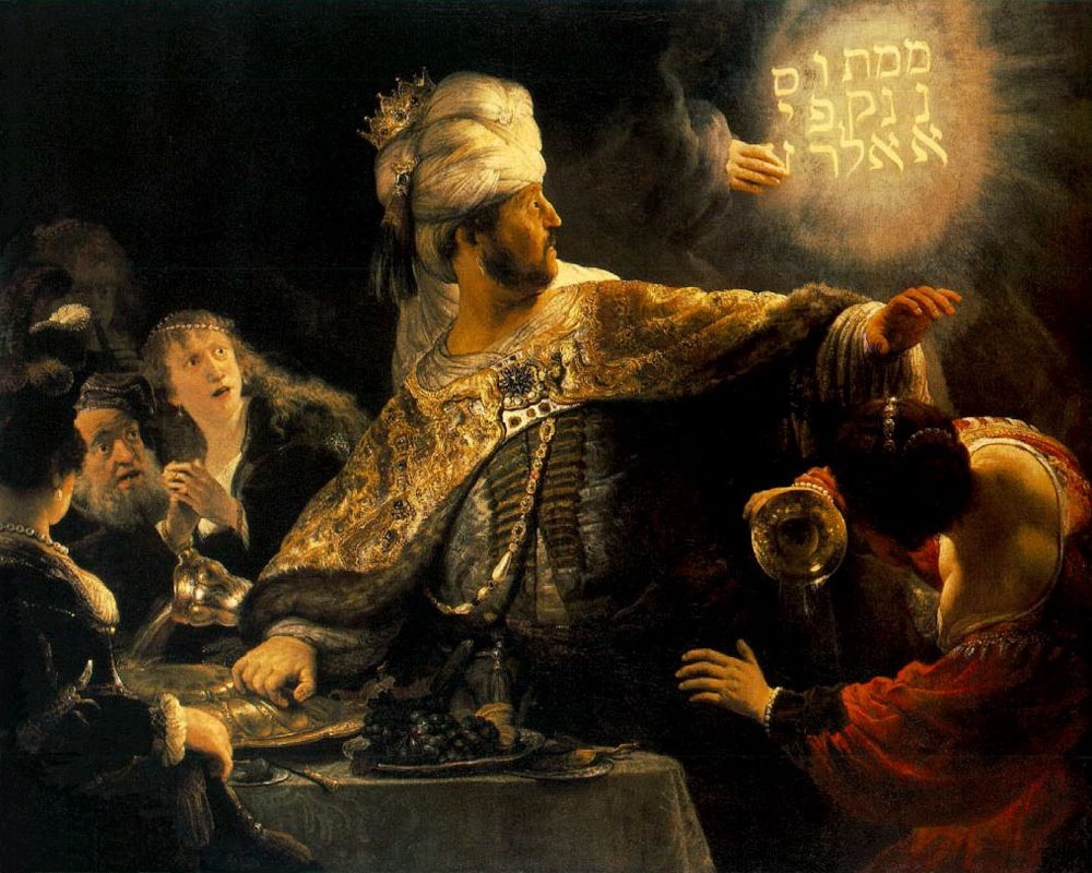 «И вот что начертано: “Мене, мене, текел, упарсин”. Вот и значение слов: “мене” — исчислил Бог царство твое и положил конец ему; “текел” — ты взвешен на весах и найден очень легким; “Перес” — разделено царство твое и дано мидянам и персам» (ст. 25-28).